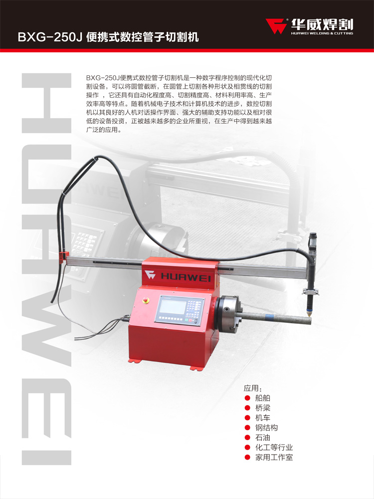 BXG-250J便攜式數控管子切割機是一種數字程序控制的現代化切割設備,可以將圓管截斷,在圓管上切割各種形狀及相貫線的切割操作 ,它還具有自動化程度高、切割精度高、材料利用率高、生產效率高等特點。隨著機械電子技術和計算機技術的進步,數控切割機以其良好的人機對話操作界面、強大的輔助支持功能以及相對很低的設備投資,正被越來越多的企業所重視,在生產中得到越來越廣泛的應用