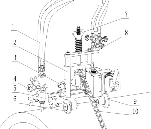 2.滑動之架 3.橫向進給旋鈕:改變割炬水平位置 4.割炬升降手輪:調節割炬高度。 5.割炬:切割厚度:5~50mm 6.滾輪:通過四只滾輪使機器在管壁平穩運行 7.大翼形螺母:擰緊該旋鈕,將逐漸收緊鏈條,可使機器牢固的固定在管子上。 8.氣體分配器:可將氣體分為預熱氧、快氧、切割氧 9.離合器分離桿:可用于控制裝置運行。 10.主體部件 11.鏈條:裝置沿導軌方向隨鏈條傳動而運行 |