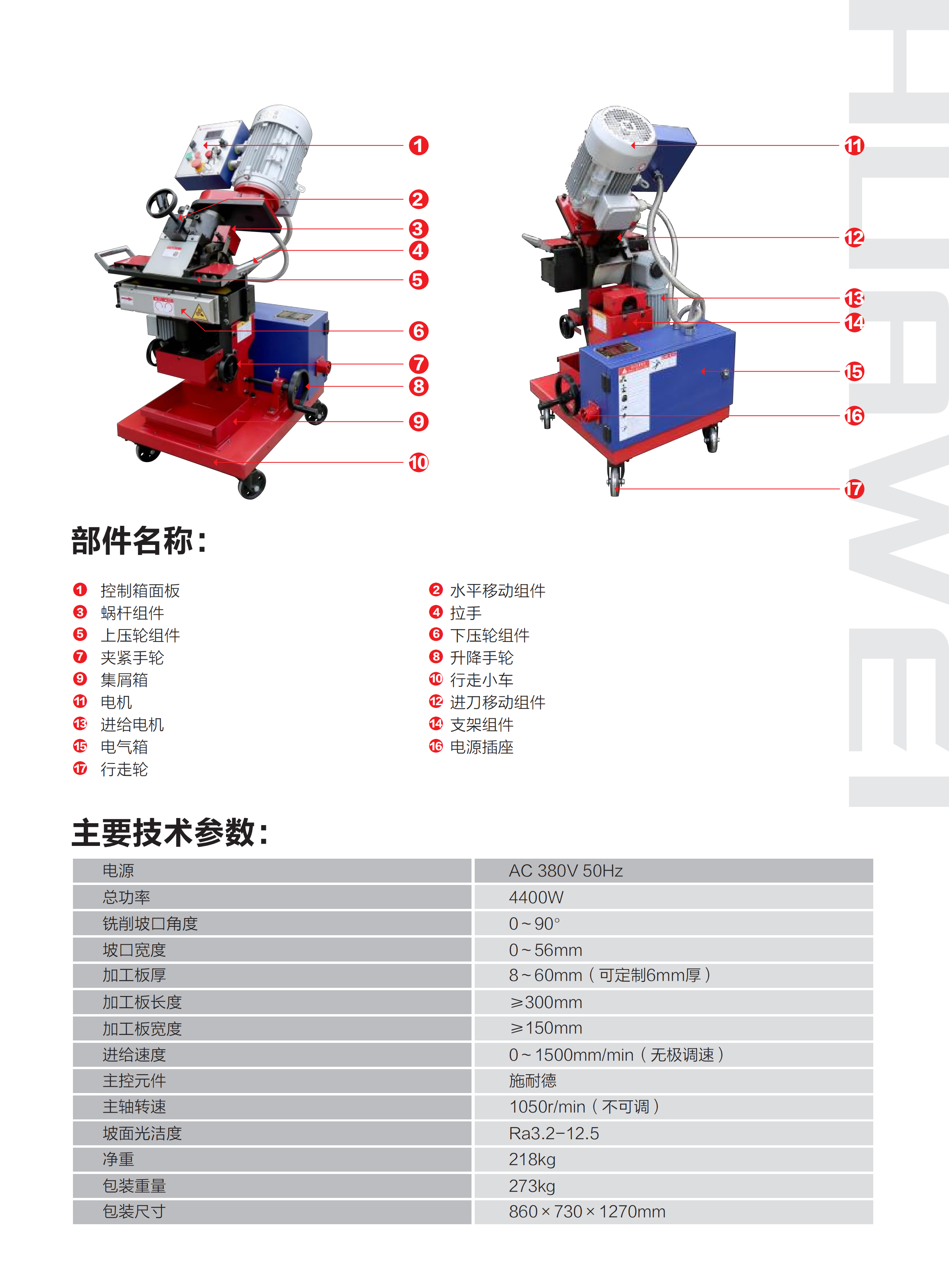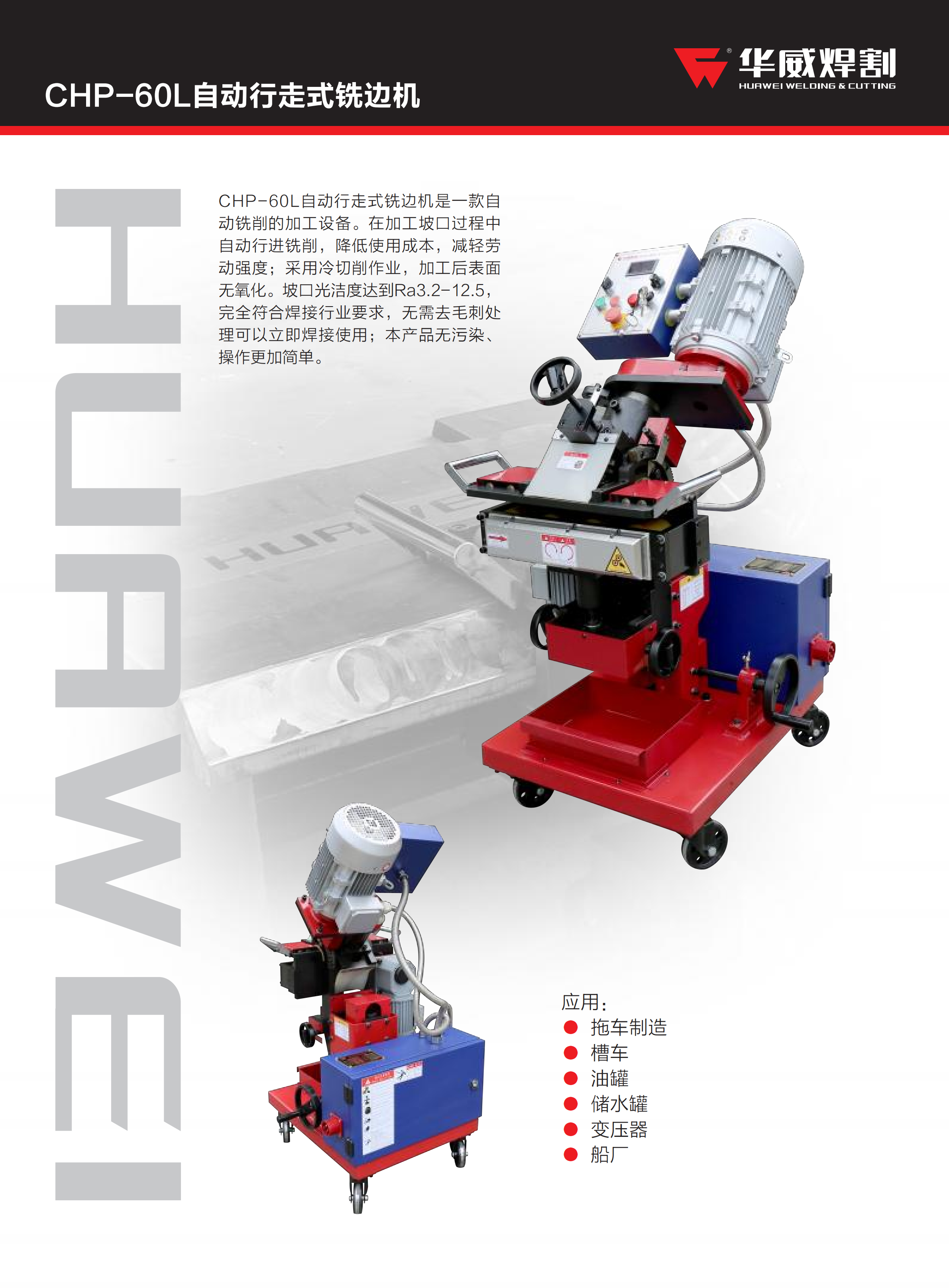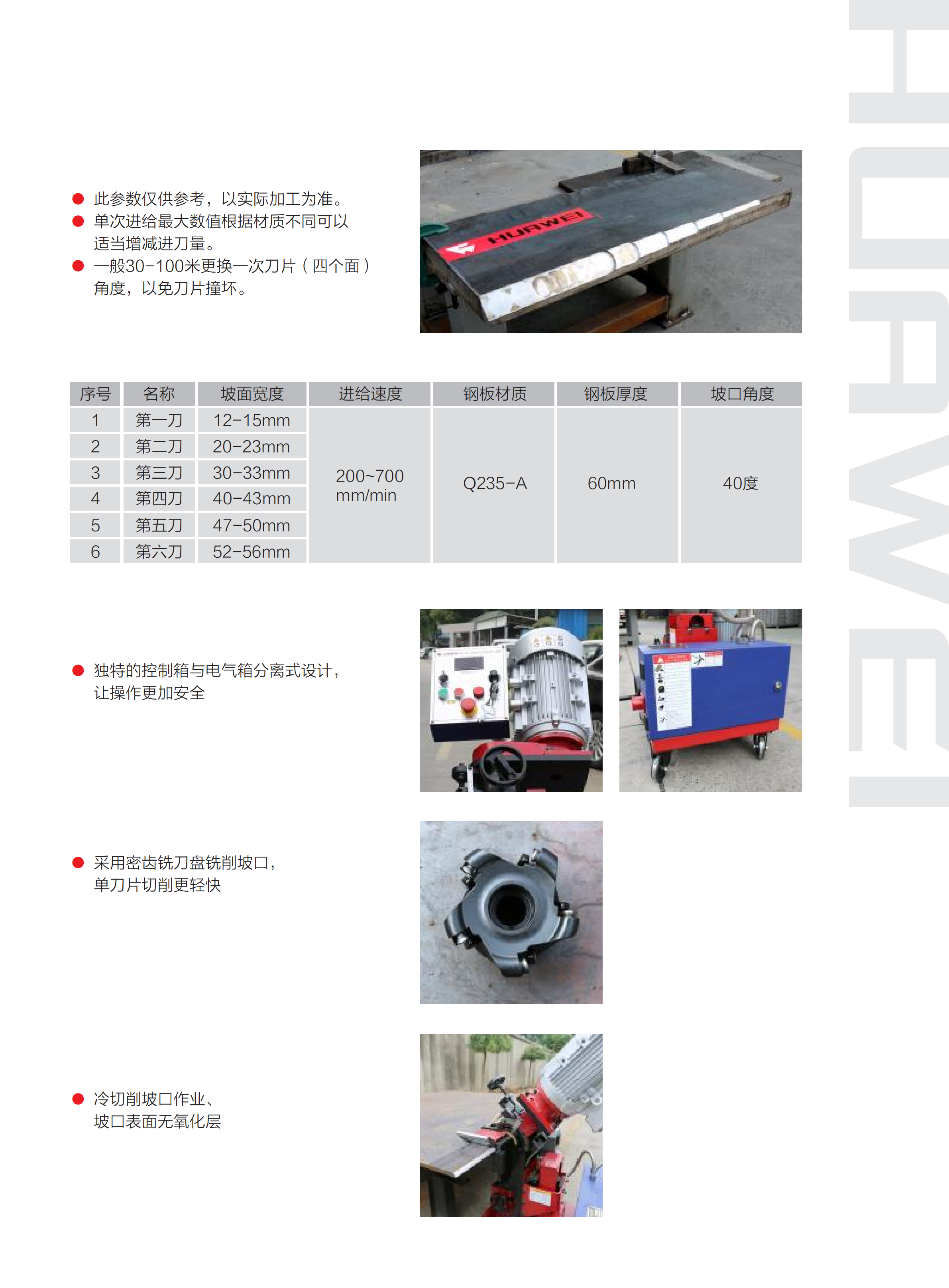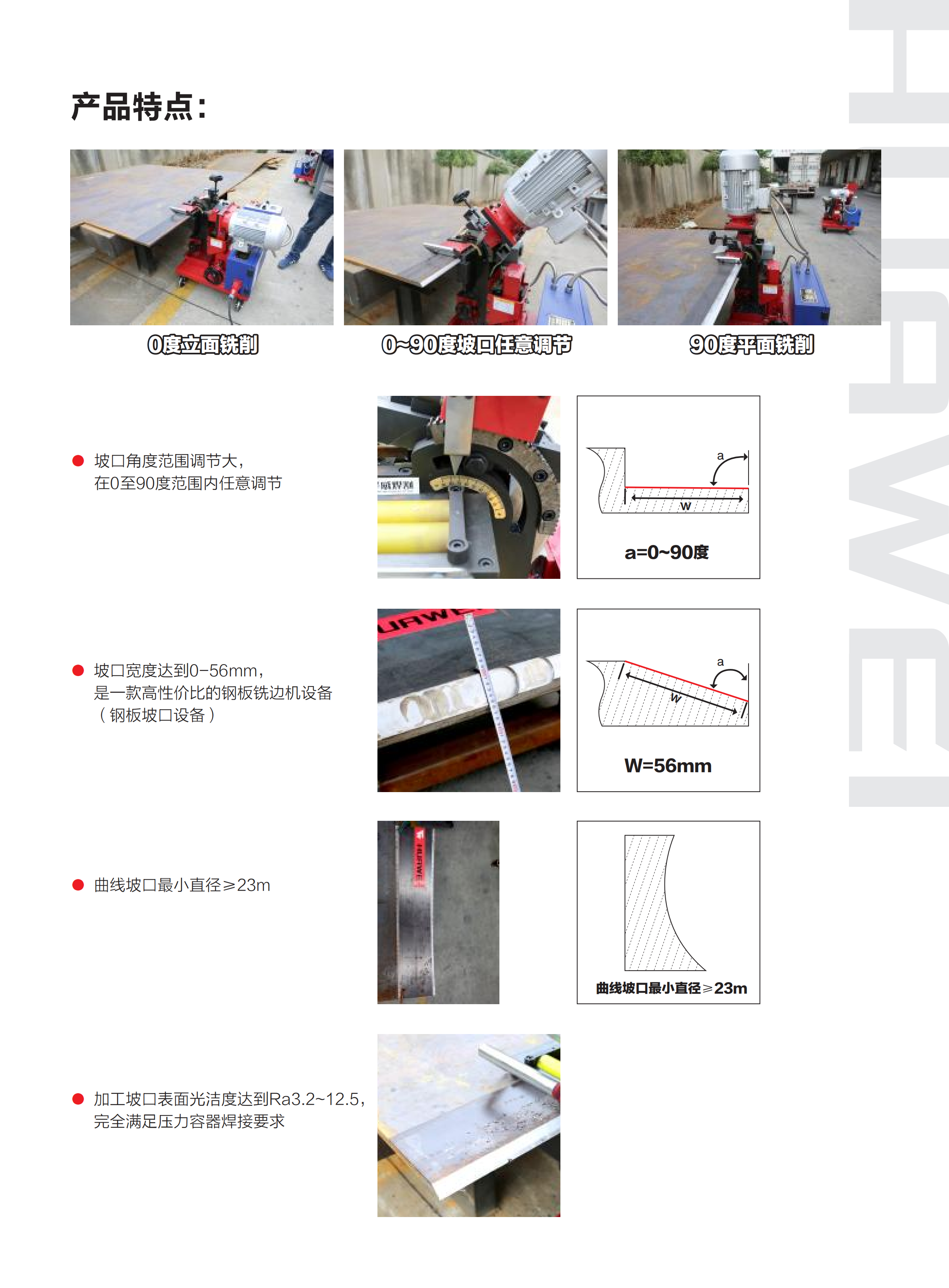 本產品是一款自動行進式銑邊設備,加工坡口過程中自動行進銑削,降低使用成本,減輕勞動強度,采用冷切削作業(yè),加工后的坡口表面無氧化。坡口表面光潔度Ra3.2~6.3.完全符合焊接行業(yè)要求,無需去毛刺處理可以立即焊接使用,本品無污染,操作更加簡單。