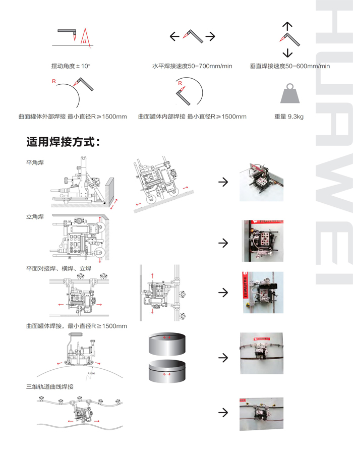 減少勞動強度,改善作業環境。提高工作效率,是手工焊的1.5倍。避免人為因素所造成的焊縫質量不良,一般的手工操作的不良率在20%左右,而采用自動焊接小車沒有產生焊接不良率, 因此其綜合效益,比手工焊提高近200%。自動化程度高,確保焊接質量的穩定性。非熟練的技術工人也能快速掌握:HK-7W-F全位置擺動式自動焊接小車是在標準角焊機的基礎上,為獲得較大的焊縫尺寸并且一次成型而開發出來的帶擺動器的焊接小車。它兼有標準角焊機簡單輕便的特點,又能進一步提高焊接效率。