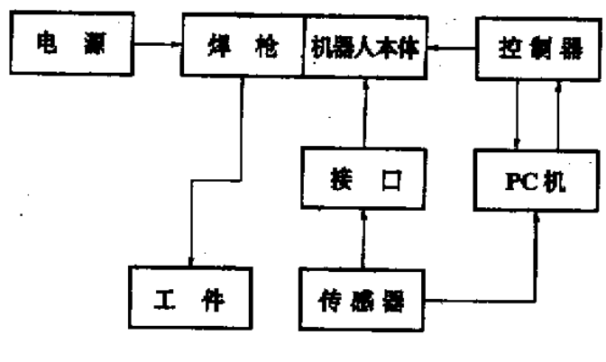 弧焊機(jī)器人焊縫跟蹤系統(tǒng)雖然經(jīng)過了幾十年的發(fā)展和計(jì)算機(jī)軟硬件的大力應(yīng)用, 但是整個(gè)系統(tǒng)的結(jié)構(gòu)沒有太大的變化?;『笝C(jī)器人焊縫跟蹤系統(tǒng)的結(jié)構(gòu)一般包括傳感器、 PC 處理機(jī)、 機(jī)器人專用控制器、 機(jī)器人本體及焊接設(shè)備等。傳感器采集到信號(hào)傳送到 PC 機(jī), 經(jīng)過一系列的數(shù)據(jù)處理過程和圖像顯示后[3], PC 機(jī)與機(jī)器人專用控制器進(jìn)行數(shù)據(jù)通訊, 然后將控制信號(hào)傳送給機(jī)器人本體控制焊接過程的正確運(yùn)行。在系統(tǒng)結(jié)構(gòu)中, 焊槍與機(jī)器人本體是固定在一起的, 由多自由度的機(jī)械手來控制焊槍的方向、 位移和速度。傳感器的位置一般通過機(jī)械接口與機(jī)器人本體連接, 甚至采用鋼性連接并一起移動(dòng)。PC 機(jī)在弧焊機(jī)器人焊縫跟蹤系統(tǒng)中的應(yīng)用是近幾年的事情, 在系統(tǒng)的跟蹤過程中, PC 機(jī)可以對(duì)傳感器接收的信號(hào)進(jìn)行預(yù)處理, 通過圖像處理軟件在可視化界面上顯示焊接過程的工作狀態(tài), PC 機(jī)與機(jī)器人專用控制器進(jìn)行數(shù)據(jù)通訊, 可以按照用戶的要求在離線編程的情況下對(duì)焊接過程進(jìn)行跟蹤控制。系統(tǒng)框圖如圖所示。