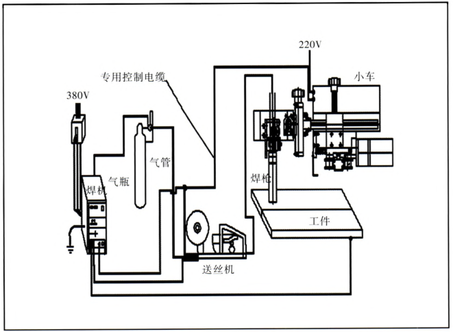 全位置自動焊接小車是一種半自動焊接設(shè)備,由小車本體、驅(qū)動裝置、控制裝置、焊槍夾持裝置組成。人工輸入工藝參數(shù)后,能夠按照一定運(yùn)行軌跡實(shí)現(xiàn)全方位自動焊接。全位置自動焊接小車在10年前由國外(韓國、德國)引進(jìn),目前該技術(shù)已經(jīng)逐步國產(chǎn)化,并有部分企業(yè)開始生產(chǎn)該產(chǎn)品。該自動焊接裝置投資少,重量只有10kg左右,可隨‘丁件移動,只需與T廠現(xiàn)有的氣體保護(hù)焊機(jī)和220V電源簡單連接即可操作(如圖1)。操作門檻低,工人只需稍有焊接基礎(chǔ),簡單培訓(xùn)后即可上崗操作。全位置自動焊接小車有兩種行走方式,一種是沿專用軌道行走,軌道靠專用磁鐵或吸盤吸附在被焊接『[件上,采用齒輪齒條方式驅(qū)動。軌道有剛性軌道和柔性軌道兩種,剛性軌道走直線,實(shí)現(xiàn)平直或豎直焊縫自動焊接;柔性軌道可以隨工件焊縫彎曲,實(shí)現(xiàn)環(huán)形焊縫自動焊接。另一種是采用磁輪行走機(jī)構(gòu),小車靠強(qiáng)磁車輪吸附于工件表面,用導(dǎo)向輪定位,沿著焊縫行走,可以實(shí)現(xiàn)直線和曲線自動焊接。全位置自動焊接小車一般設(shè)有一個或兩個焊槍夾持裝置,用來夾持普通氣體保護(hù)焊機(jī)的焊槍。焊槍夾持裝置設(shè)有專用直線往返式擺動裝置,用數(shù)字方式調(diào)節(jié)擺動幅度、中心位置的移動、左停止時間、右停止時間及擺動速度,并具有停止焊接時焊槍自動停止在中心回位的功能。自動焊接擺動小車,與手工焊接相比,焊接幾乎不受焊工技術(shù)水平的影響;焊接過程穩(wěn)定,缺陷少,焊縫表面清潔,焊接質(zhì)量提高;焊接過程中,焊絲可以連續(xù)送進(jìn),熔敷速度快,減少了焊工換焊條或變換姿勢或休息的時間,大大提高了生產(chǎn)率;可進(jìn)行一次性長距離焊接,焊接過程飛濺小,煙塵少,可以一人操作兩臺設(shè)備,大大降低了工人的勞動強(qiáng)度。