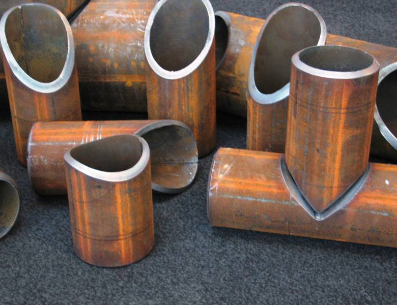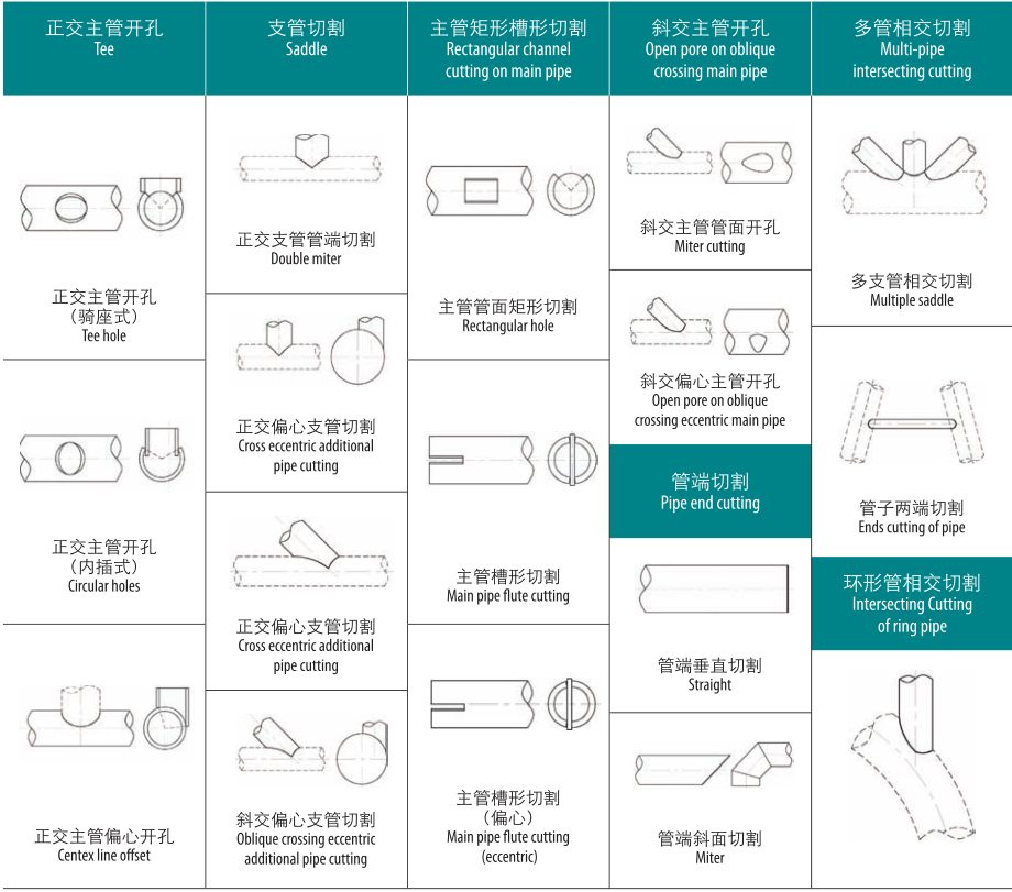本機是一種對鋼管端部結合處作自動計算和切斷的設備。該機器能廣泛應用于建筑、化工、機械、冶金等行業的管道結構件的切割加工。這些行業中有大量的管道結和相貫線孔、相貫線端頭,還有俗稱“蝦米節”的彎頭,此類加工大多采用制作樣板、劃線、人工放樣、手工切割、人工打磨等落后又繁復的方法來進行。而本機能十分方便的切割此類工件,并且操作人員不需計算與手工編程、只需輸入相互配合的管子的半徑、相交角度等參數,機器就能自動切割出管子的相貫線、相貫孔、以及焊接坡口。